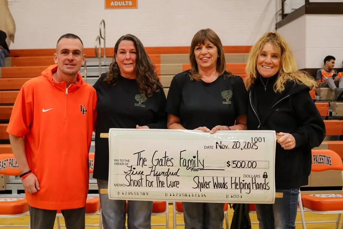 Tristan Reynolds, East Palestine Boys Head Basketball Coach, accepted a donation for the Gates family. Presenting the check were SWHH Vice President Robin Kuhn, SWHH Board Member Cindy Guterba and SWHH President Lana Wilt .